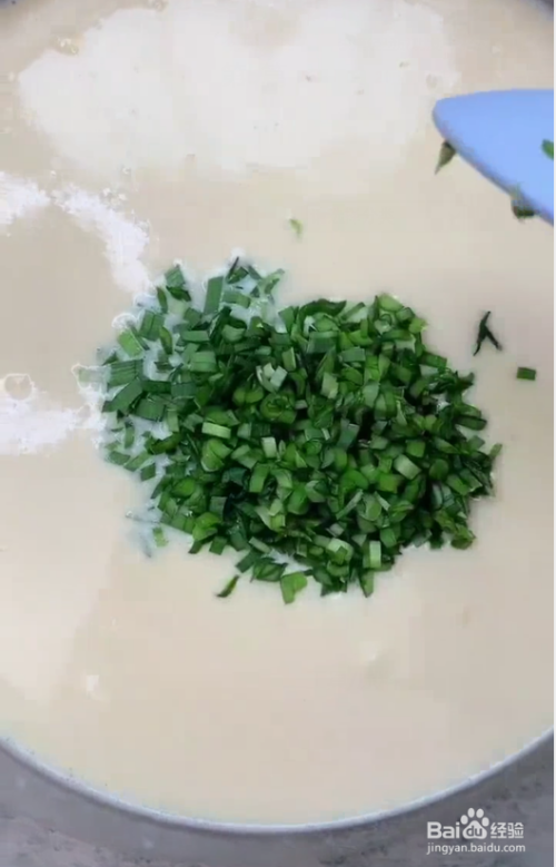 再加入少许的温水,将面糊搅拌成无颗粒状态之后,再加入一小碗切好的韭菜段。
