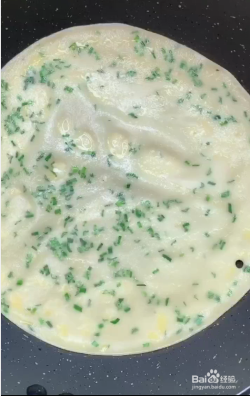 等鸡蛋饼的一面煎至微微发黄之后,再将其翻面煎至发黄,即可取出锅食用。