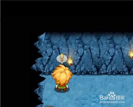 第一步:首先我们需要一直往上走,然后我们会看到一个蓝色精灵,我们向左拐,向下掉的火把就是机关。