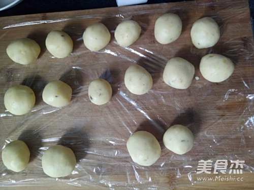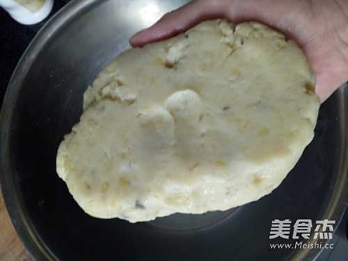 绿豆去皮蒸熟压成泥,加入玉米淀粉进行翻炒直至可以成团如图所示