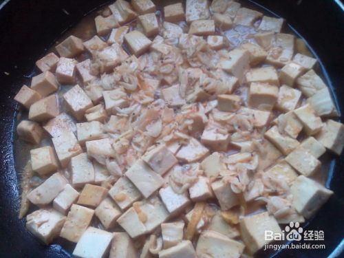 放虾皮。豆腐搅拌一会后,倒入适量的水,这样以免锅糊底,再把虾皮均匀的撒到豆腐上。