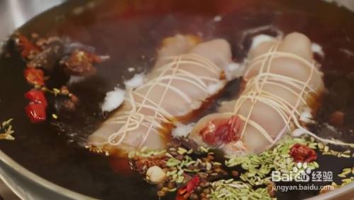 然后将处理好的猪皮卷下锅,加入适量清水、小茴香5g、花椒2g、丁香5粒、八角2粒、桂皮1片、草果1个、草寇1个、干辣椒10粒,酱油、料酒5勺、盐5匙、葱段、姜片制成卤味酱汤,接着炖上一个小时,最后焖上4-5个小时。