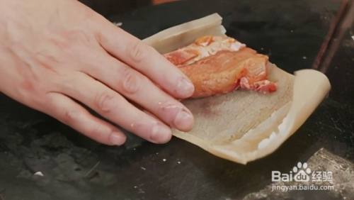 接着将腌制过的猪肉切成大小合适的形状,放入猪皮里面,再把猪皮一圈圈卷起来。