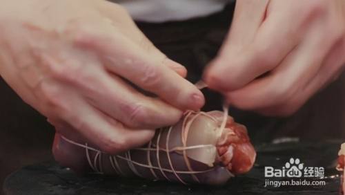 卷好之后的猪皮用棉线横向紧紧的绑起来,让猪皮和里面的猪肉融为一体,充分固定。
