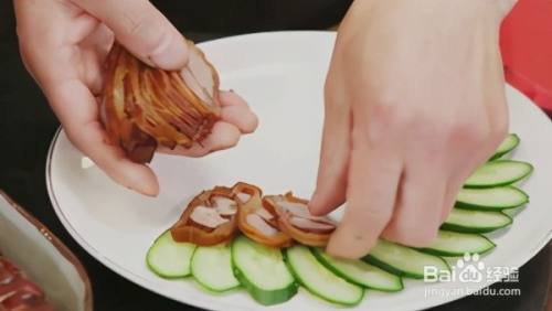 卤好的猪肉取出,解开捆绑的棉线,然后一刀刀将猪皮卷切成薄片,再摆在盘子里。