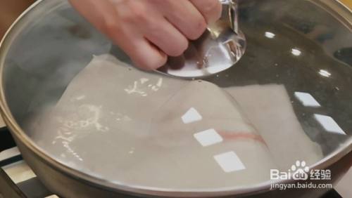 将新鲜的猪皮清洗干净后下锅煮2-3分钟,捞出之后用冷水清洗干净,然后将猪皮表面的残余猪毛处理干净。