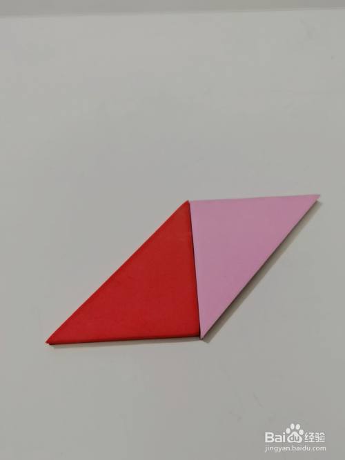 拿出一块粉色大号三角形板放在红色大号板的右边,如图所示。