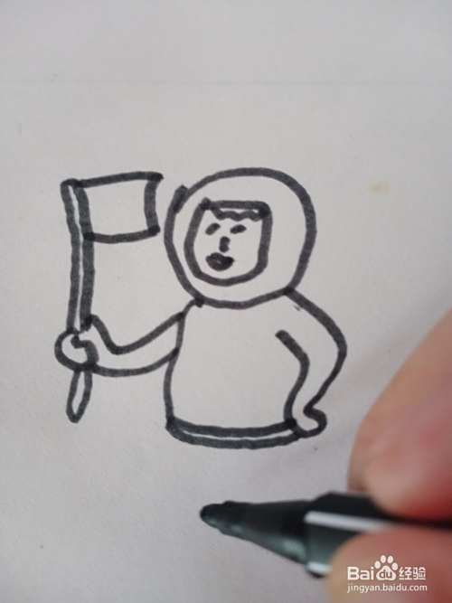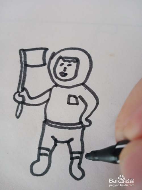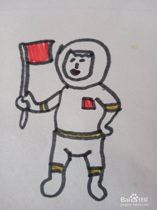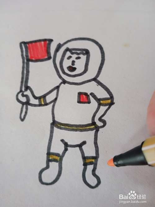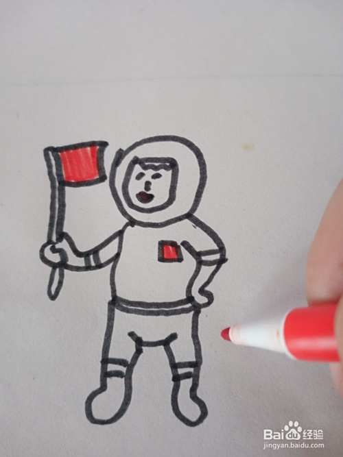 画出宇航服上面的装饰,把宇航服前面的口袋涂成红色,右手拿的旗子涂成红色。