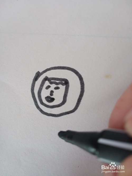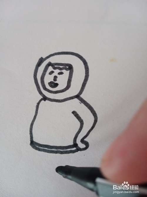 首先画出宇航员的头部和帽子,画出宇航员的眼睛,鼻子,嘴巴。