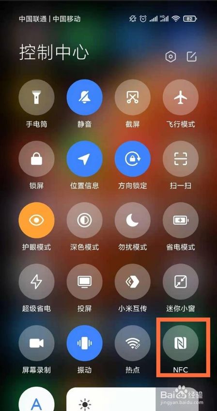 3、也可以直接下拉滑出控制中心,找到NFC图标开启即可。