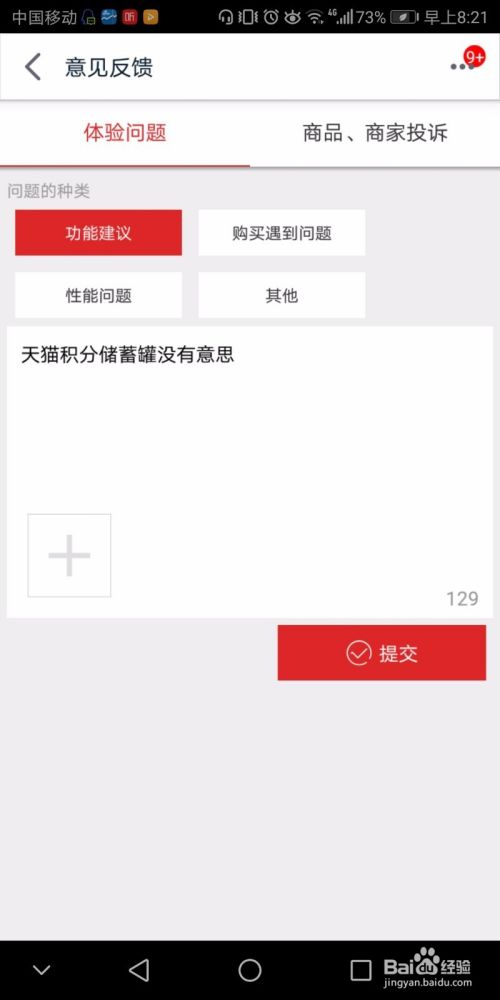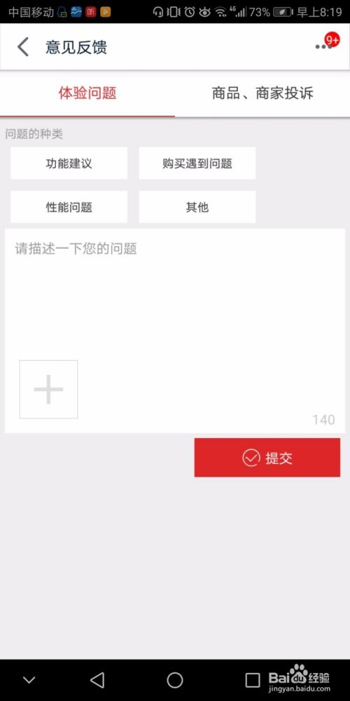 点击进入意见反馈界面后,这里包括体验反馈和商品、商家投诉两种意见反馈。