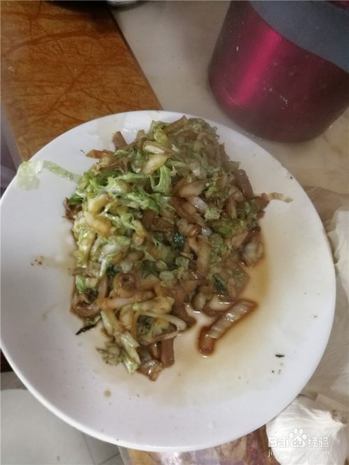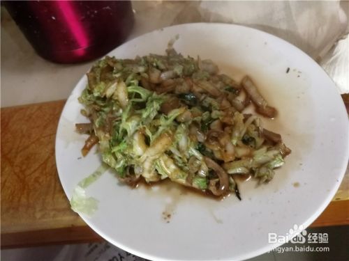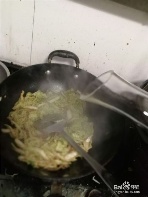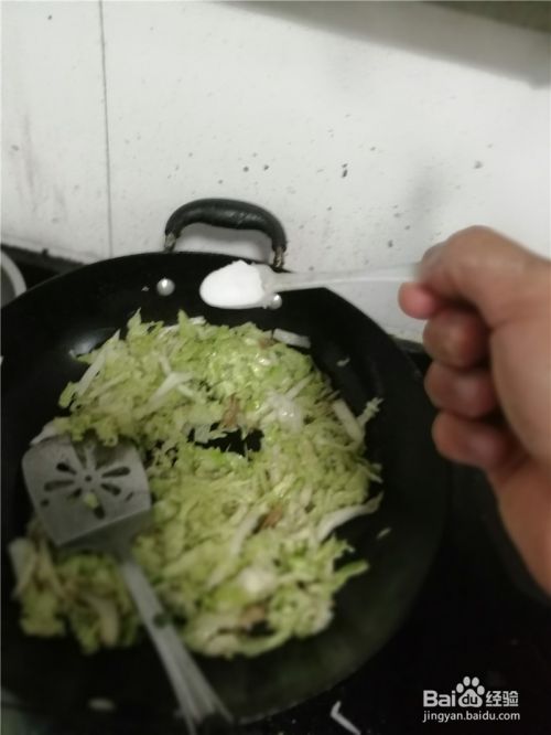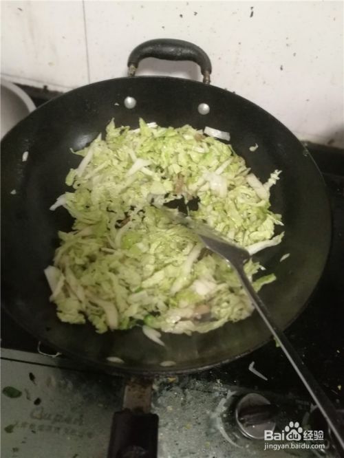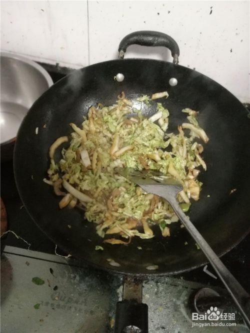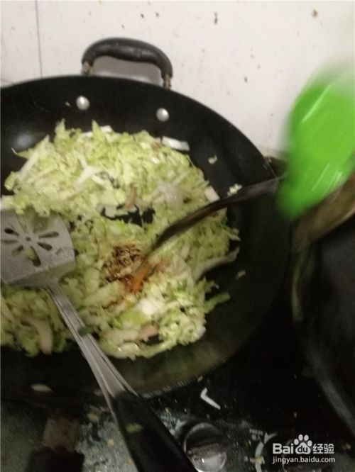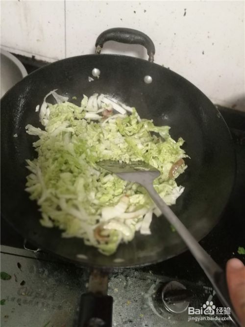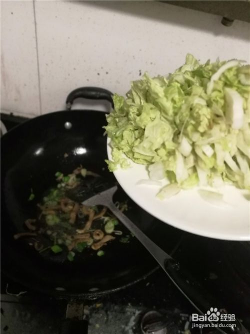 然后倒入洗净后,切好的白菜丝翻炒