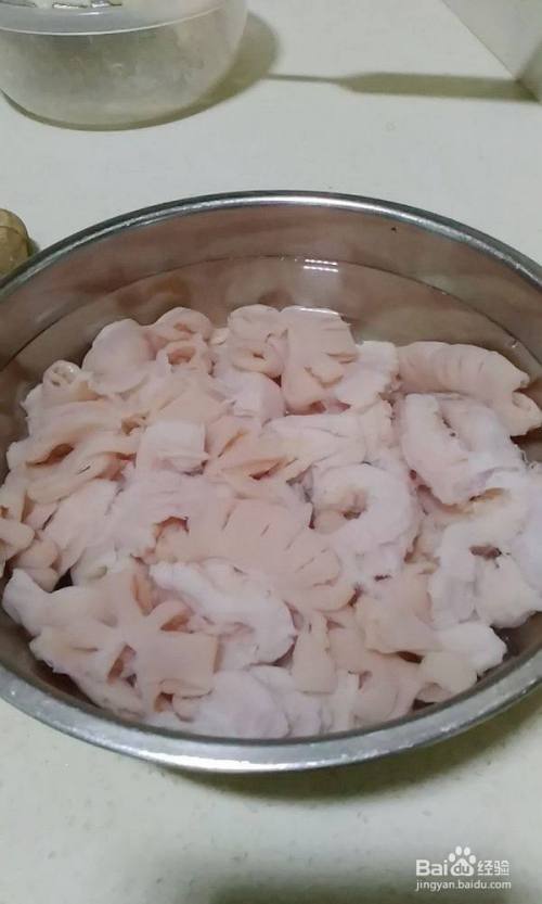 准备材料,猪生肠用水加入一勺米酒浸泡15分钟再冲洗干净