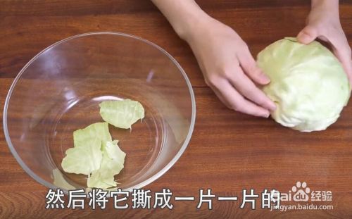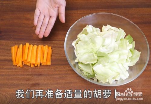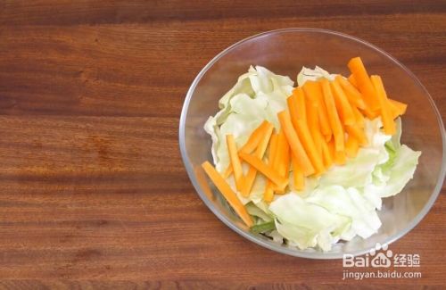 首先将卷心菜洗干净,然后用手撕碎或用刀切碎,在将准备好的胡萝卜洗净切条,如图