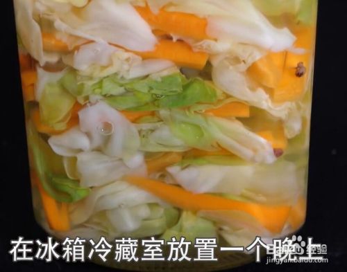然后将玻璃瓶放到冰箱冷藏室放置一个晚上,美味可口的泡菜就做好了,如图