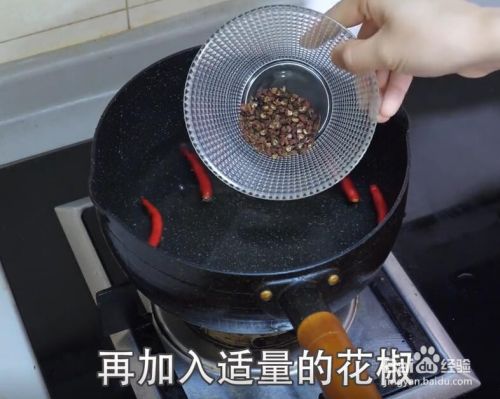 然后在锅中放入300ML水、适量的小米辣、香叶、花椒、姜片、食盐10g。然后将水烧开,烧开后转小火烧3分钟,如图