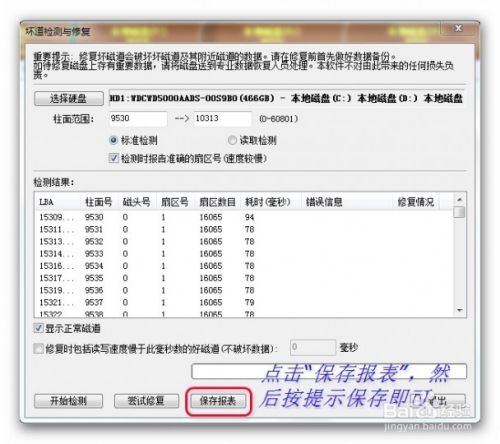 扫描结束,保存报表。打开报表查看坏道位置,柱面号,是我们要记住的坏道位置。我们的硬盘无论多大,1G空间大约占用131个柱面。
