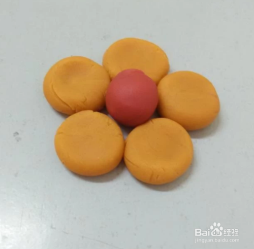 然后把桔黄色长条分成一样大的五块,然后把五块橡皮泥团成圆球。
