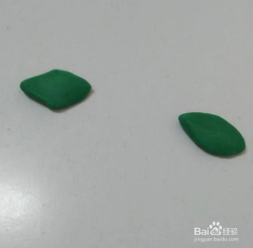 此后用绿色捏两个枣核形状,当作两个叶子,在叶子上面刻一个小字,当作叶脉。