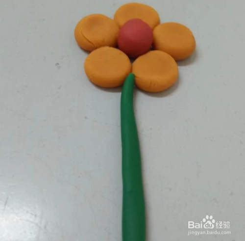 随后用绿色搓一个细长条,粘在花朵下面,当作花茎。