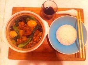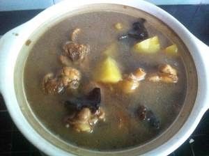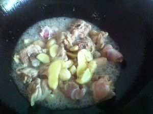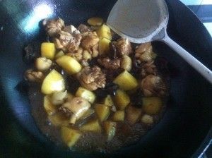 土豆木耳一起放进去翻炒,再加入料酒老抽上色,盐生抽白糖调味,倒入开水没过鸡腿肉