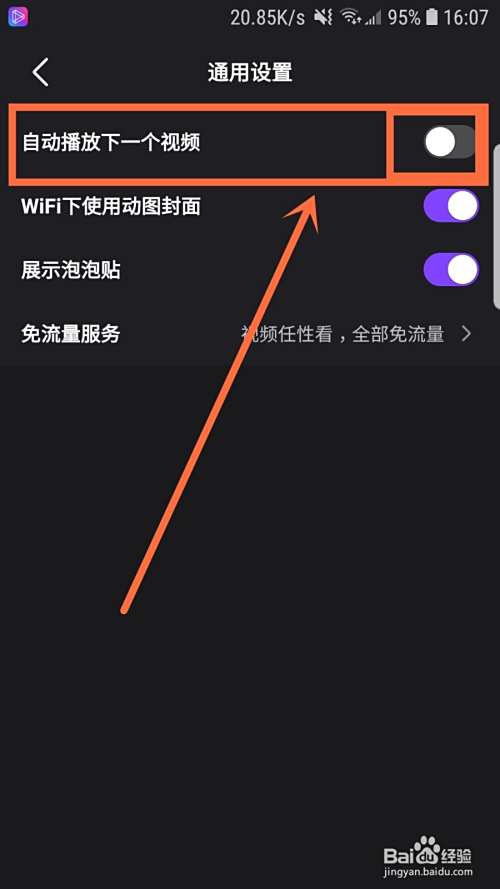 在通用设置界面中,点击自动播放下一个视频后面的开启按钮进入。