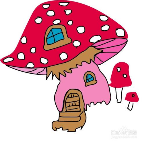 使用品红色与白色填充蘑菇屋的屋顶,再用蓝色与褐色搭配填充窗户与大门,使用粉红色填充蘑菇屋的支柱,完成蘑菇屋的卡通画设计。