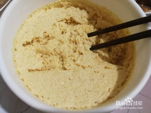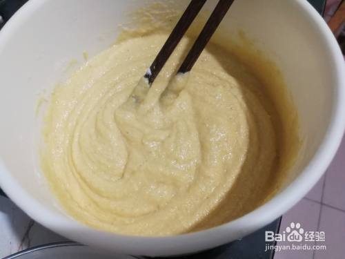 玉米粉放入盆中,倒入70°左右的水搅拌至没有干粉,放入面粉,白糖,酵母加水搅拌成糊状。