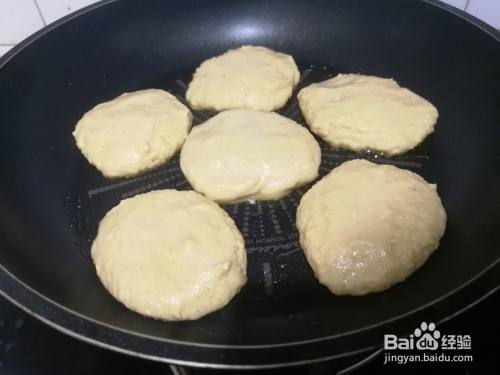 开小火,平底不粘锅倒入食用油,取适量面糊放入锅中做成玉米饼胚。