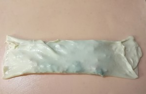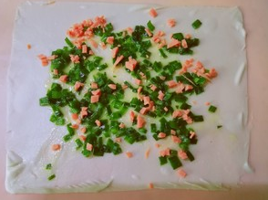 切去边,放入做好的韭菜油酥、火腿肠末
