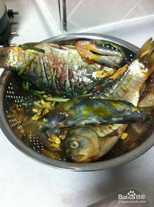 葱、姜、生抽、料酒、盐全部抹匀在鱼的表面和里面腌个10分钟。