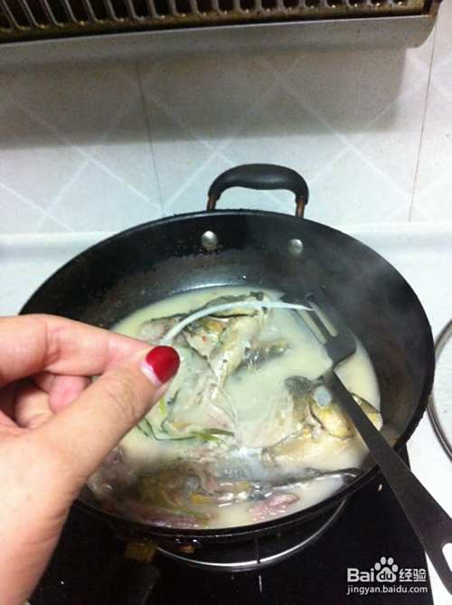 不多时,奶白色的汤就出来了,冷水是不可能煮出来的哦~多煮一会,把鱼骨的胶质炖出来。因为不是煮鱼汤所以就不要担心肉会煮太老啦~