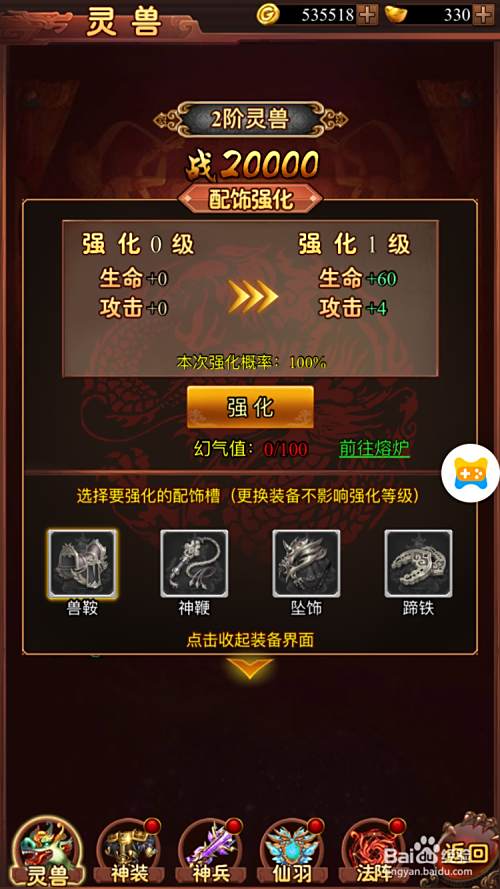 另外一个提高灵兽战斗力的方式是强化灵兽装备,点击配饰强化进入到强化界面,强化配饰消耗幻气值,幻气值可以在熔炉中进行分解灵兽装备获取,如下: