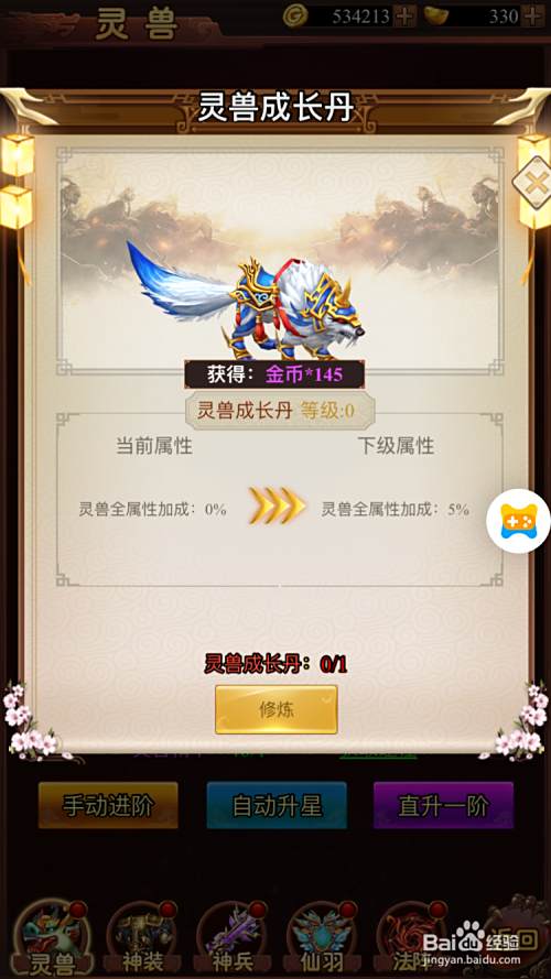 使用灵兽成长丹可以快速升级灵兽,不同的成长等级能够进行不同程度的属性加成,可以通过购买和活动等方式获取。