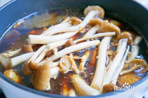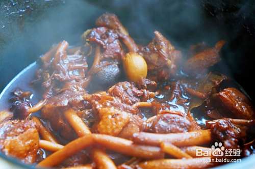 炖至鸭肉成熟,这个时候鸭肉只是熟了但还够烂。放入茶树菇继续炖煮至鸭肉软烂