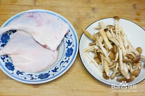 准备好食材。鸭腿选用的是鸭边腿,感觉比普通鸭腿肉质嫩一些。茶树菇去除根部洗净