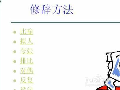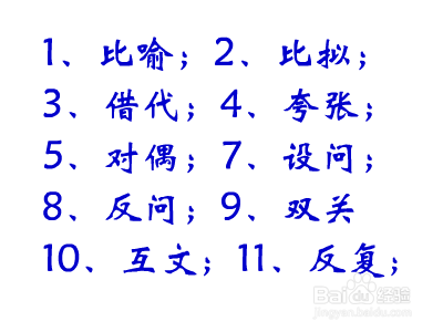 首先,我们需要先学习一下语文课本中都有哪些修辞手法,都有哪些呢?比如:比喻、夸张、拟人、排比等等。