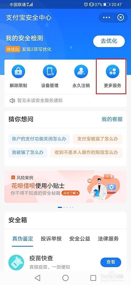 第二步进去之后,点击安全中心->更多服务