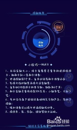 其次,该平台还可以帮用户的信用卡进行提额概率分析,通过这个分析结果,用户可以明确的看到自己的信用卡当前办理提额成功的几率。如果已经达到银行要求,那么用户便可以提交提额申请;反之,若没有达到要求,用户还需要根据平台的建议继续刷卡,提升信用卡提额的成功率!
