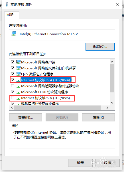 在本地连接属性界面将“Internet 协议版本 6 (ICP/IPv6)”前面的√去掉,然后选中“Internet 协议版本 4 (ICP/IPv4)”双击打开属性界面。