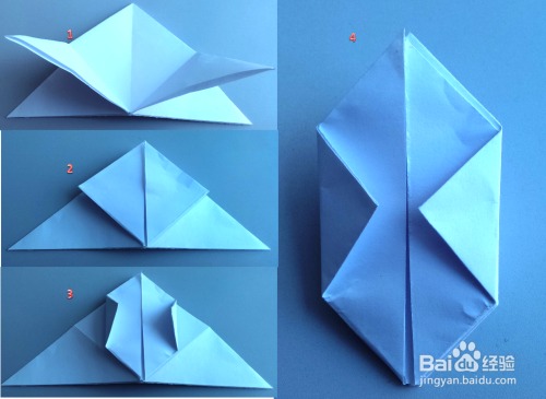 将三角形的两个角向上对折1,出现一个小方块2。把小方块的角对折3,然后将另外一面也重复1,2,3. 形成如4所示.