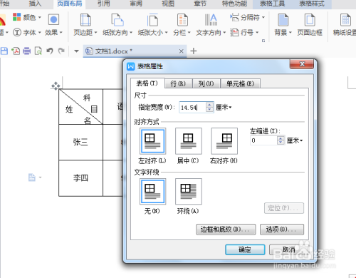 弹出表格属性框,我们能看到表格栏中对齐方式为左对齐,我们若是需要让表格居中,选择居中对齐,点击确定,表格就在中间。