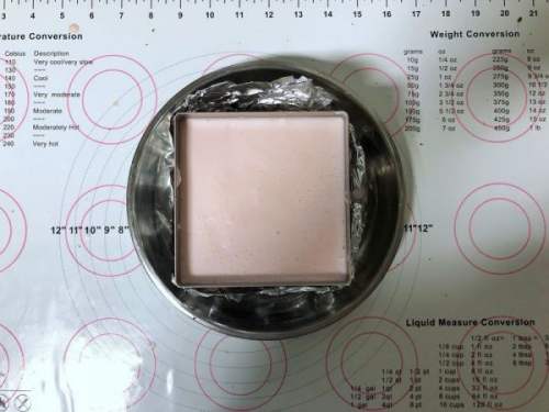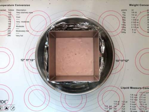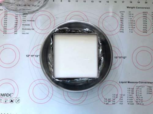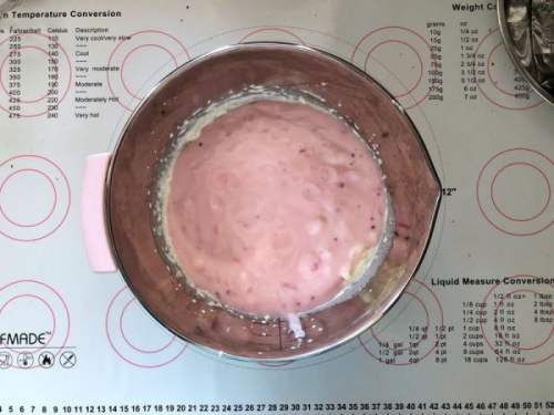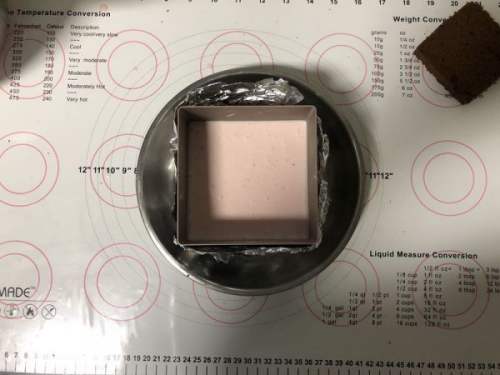 2828、冷冻好的慕斯取出,倒入酸奶慕斯液,晃平表面,如果有气泡要用牙签挑破,这样才能得到光滑细腻有光泽的慕斯表面。放入冰箱冷藏过夜。