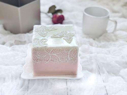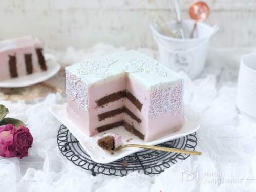 2929、冷藏好的慕斯用电吹风吹一圈后脱模,用巧克力蕾丝装饰。