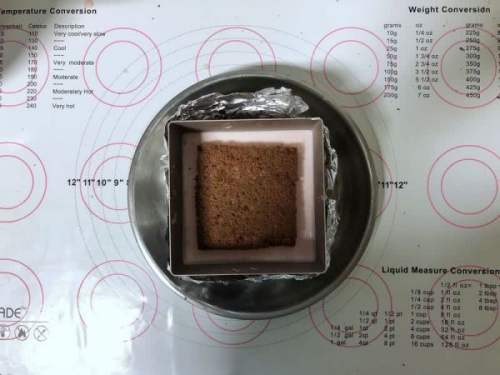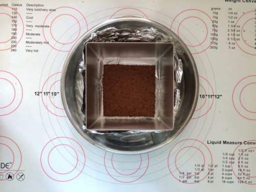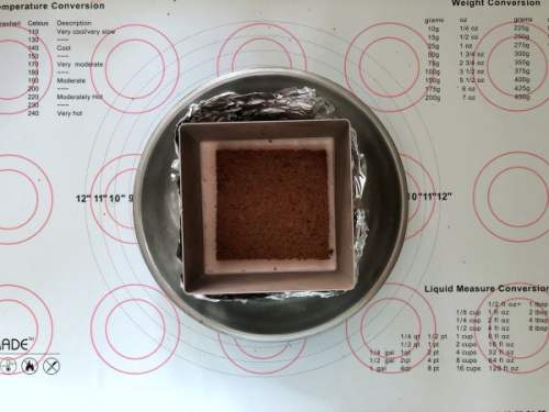 2121、慕斯圈包好锡纸,放入一片蛋糕片。