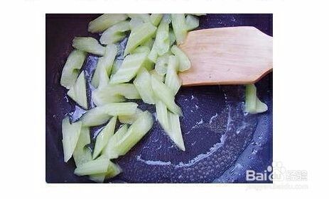 西芹用刮刀将表面筋膜撕去,斜切成细片,蒜切成片。油锅小火爆香蒜片,放入西芹翻炒。