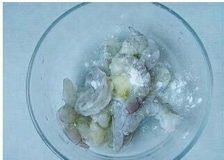 虾仁用绍酒和盐腌制15分钟,然后入热水锅中焯烫变色即可捞出