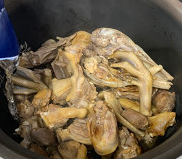 将焯过水的的老鸭用清水冲洗干净,冲洗干净后的老鸭,这里可以将多余的油脂剪去不要,将洗净的老鸭沥尽水分。
