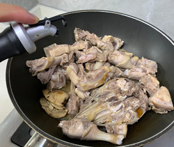 老鸭倒回锅中,将表面水分炒干。(锅内无油),炒至老鸭表面略微出油。倒入料酒翻炒一下。(也可以用祖传陈年酿制的黄油?)