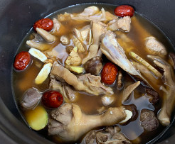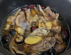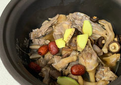 加入香菇、生姜、红枣。加入神秘食材,炖制老鸭汤的基础配料,有点像当归,起到缓解鸭肉的气味,以及提升鸭肉清补的作用。(如果是制作滋补类型,这里可以直接加入滋补药材一起炖制)
